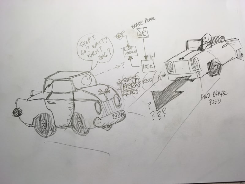 One consistent problem with traffic/driver interaction is the guesswork required to judge if/when a person approaching is braking his/her vehicle, specifically to make a turn. Crossing and entering traffic is a key source of accidents. In this invention, a forward brake light (high intensity red) comprised of LED elements capable of changing hue as brake pressure is applied, would serve to provide a visible confirmation that the driver is, in fact, braking. An argument that this would falsely lure a waiting driver into the street is moot, because if the color/hue of the light is not fully red (beyond a certain saturation) the indication would be to not proceed. However, in contrast, if a person sees an on-coming vehicle that does NOT show forward brake indication, the greater good would be served by making entry into traffic contra-indicated. Operation could be associated with turn signal logic, but would not be required.