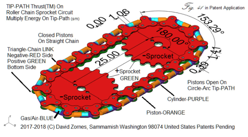 Figure COLORS: A roller chain in prior art is a way of transmitting mechanical power from one place to another through linear links (like on a bicycle chain) arranged in or extending along a straight or nearly straight line “linear movement” that are assembled around on sprockets (GREEN-Positive and RED-Negative, layered over middle WHITE-Insulator) providing a rotating roller chain drive ELECTRIC circuit. Cylinders (PURPLE) and Pistons (ORANGE) in the illustration are OPEN "cross-sectional" views, so you can see the spacing (BLUE), just for illustration purposes. Sealed pistons are Stirling or heat engines, just heated and cooled by any heat, even focused Sunlight or nuclear elements. In DESIGN OPTION: Chain links are separate circuits in contact with Sprocket's faces (planes), both separate electric conductors are on each layered plane: GREEN-Positive and RED-Negative separated by "WHITE-Insulated" middle-materials with circuited electric components wired, between the links, providing wire motor or generator coils, piezoelectric wiring, sensors, valve controls, and other aerodynamic propulsion elements. Not done yet, but finishing a design, where sprockets are aircraft propulsion propellers and fans, in one project the whole aircraft's "aerodynamically" curved wing surface is rotating around the wing section on hybrid electric roller chains (in Patent Pending too).
