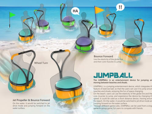 JUMPBALL is a jumping entertainment device, which integrates the feature of an exercise ball, so that the users can use it to jump around beaches and shoals, enjoying the fun of space changing.