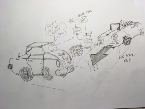 One consistent problem with traffic/driver interaction is the guesswork required to judge if/when a person approaching is braking his/her vehicle, specifically to make a turn. Crossing and entering traffic is a key source of accidents. In this invention, a forward brake light (high intensity red) comprised of LED elements capable of changing hue as brake pressure is applied,