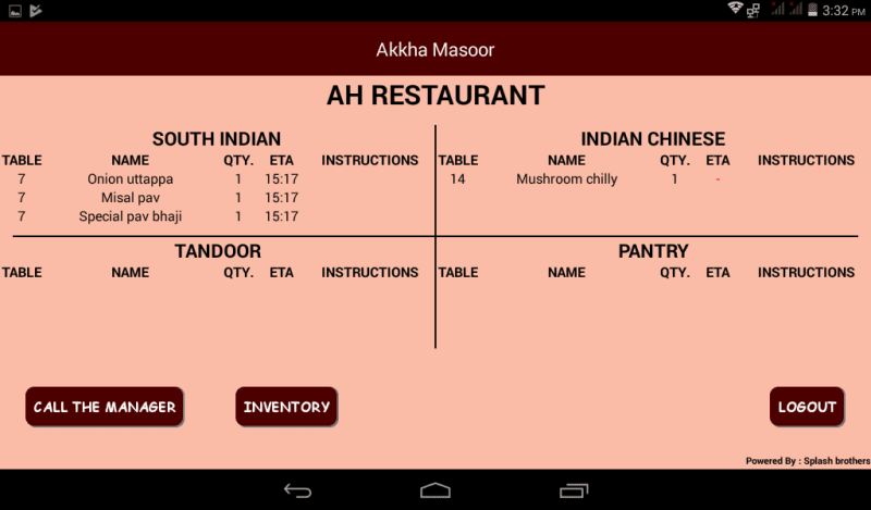 FoodNinja places touchpoints at the customer table, kitchen rooms, and floor manager and connects all the entities in the process. The customer places orders through the tablets which is displayed in the kitchens; manager manages the tables with super-admin access to the whole system; customer can notify the manager about anything real-time; payment is done though the tablet directly and our system takes care of billing. Along with this, the system comes packed with inventory management unit, table reservation management unit, algorithms to up-sell and cross-sell dishes, customer loyalty management, data-based insights, backward integration with suppliers of the restaurant, waste management through inputs from customers and collaboration with NGOs in the field.