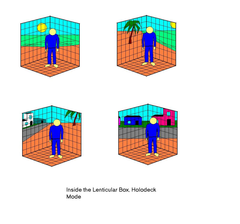 A typical box or cube has six faces, twelve edge-on views and eight corner views for the maximum number of views that can fit symmetrically on my original Lenticular Box, with a 3-D cubical cell resolution of 9 and 26 total viewing angles around or inside a Lenticular Box, either in low-tech invisible or low-tech holodeck modes of operation.