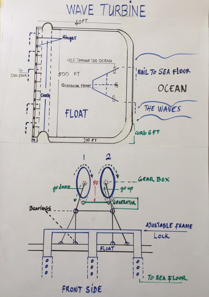 This is a Wave Turbine. This concept produces electricity. First we have to build a Float. That is 500 ft L x 40 ft W x 10 ft H, weight 3000 lbs. We have a curb 6 ft high at the edge to collect the waves. One side of the float is nailed to a frame that is attached to the bottom of the sea. The ocean always produces waves. The waves will hit the float which will make the float go up and down. Then in the middle of the float there will be another frame. That will carry the Generator. The Generator will be installed to the spindles weight 500 lbs each spindles. In the middle of the spindles we have a gear box connected to a lever arm that is 5 ft long. When the waves hit the float it goes up turning spindle 2. When the float goes down turning spindle 1 the spindles take turns spinning so it can pull the Generator. This produces electricity. We have an adjustable frame nailed to the sea floor to control the float. The maximum of the float waving up is 6 ft high. When there is a big wave we can lock the float for safety.
