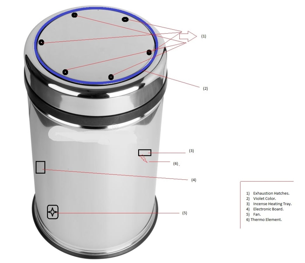 Right after that an electric signal will be sent to the fan so that the incense smoke will be ejected out of the Exhaustion Hatches from the top of the Smart Trash Tin.