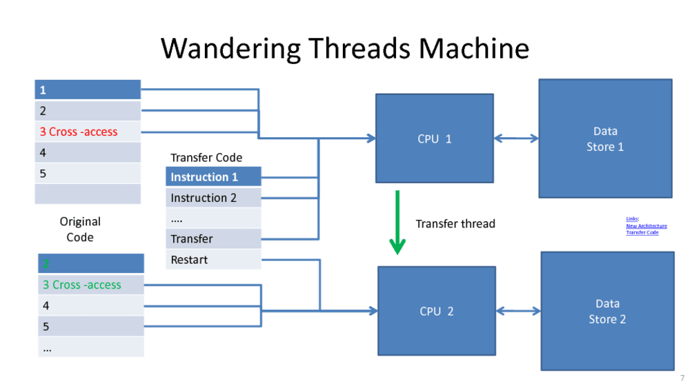 This idea came from the analysis of why symmetric-multi-processing (SMP) architectures failed to perform well when given an intrinsically parallel software task (circuit simulation in Verilog) - despite being able to get as many as 48 CPUs on a chip these days, simulation acceleration usually tops out at about 4x on 8 cores. The two problems with SMP are data-bus congestion and missing cache, and the idea with "wandering threads" (WT) is to alleviate that by enabling more efficient use of CPU caches, and taking traffic off the data bus, by moving threads instead of data.