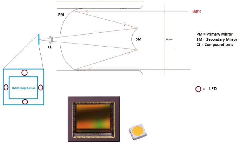 A 200 mm long and 80 mm diameter barrel camera for use in light data communication will be designed. It comprises of a 2048 × 2048 RGB CMOS sensor with 5.5 µm pixel size, a focussing lens arrangement to achieve 360 mm focal length, LED array with 5000 lumens output and an electro-optic beam reflector. LED modulated with binary data will illuminate the barrel camera which will capture the image of the LED as well as receive the binary data. An acknowledgement binary data will be sent from the barrel camera back which will be captured by a photodiode with parabolic reflector.