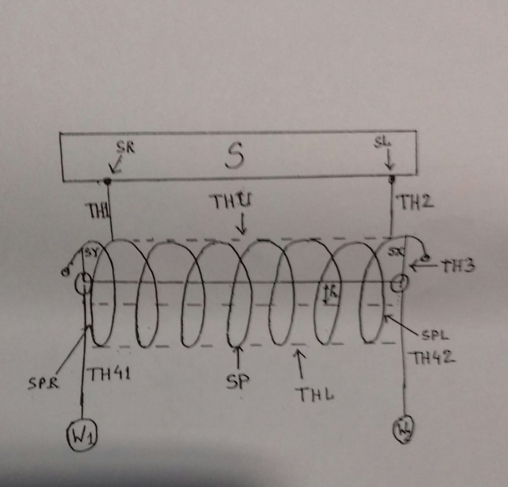 Image 2 shows the ends of thread TH1 and TH2 being connected to lower end of outer diameter A and B of either end of spring SP1. The upper ends of outer diameter of spring SP1 are connected to threads TH1A and TH1B which are in turn connected to support S. The total length from TH1 ,TH1A plus the outer diameter of spring SP1 is fixed and not changeable and so is the length from TH2 ,TH1B plus the outer diameter of spring SP1. This increases the effective distance moved perpendicular to the direction of gravity and also the effective height h as in image 1.