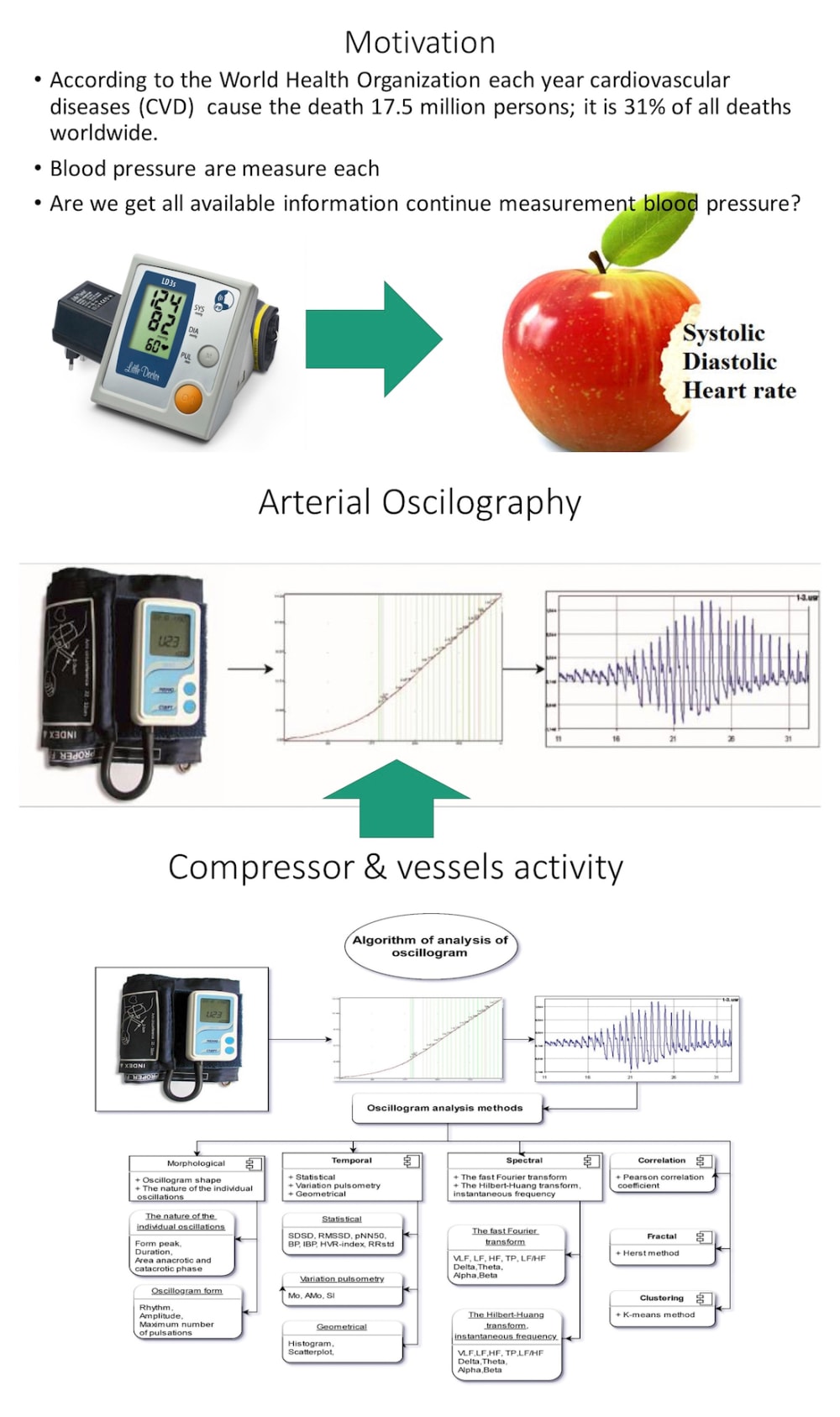 Pressure curve is traditionally used to determine blood pressure and heart rate. Some modern devices propose a possibility to assess arrhythmias. The authors of the work proposed the methods of morphological, temporal, spectral, fractal analysis of oscillograms. Calculated figures were used for their further correlation and cluster analysis. Analysis information technologies of arterial oscillograms were developed and implemented in software environment, which may be an independent product and be included in software environment complex.