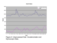 Figures 2 and 3 display the unprocessed signal flow recorded during a gait assessment trial run and the Fourier Transform spectrum obtained from the raw pitch, yaw and roll axis accelerometer and gyroscopic data using our proprietary frequency domain signal processing algorithms. The raw data displayed in Figure 2 were collected during the completion of one complete stride cycle. Although interesting in a qualitative sense, such unprocessed plots provide neither predictive information of falls nor diagnostic identification of specific neurological pathologies or impairment.