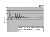 In contrast, the Fourier transform processed stride data shown in Figure 3 reveal the dominant frequencies associated with an individual's gait. This ensemble of frequencies and their associated amplitudes comprise a unique signature. For clinical applications, empirically determined signature variations characteristic of strokes, imbalances, etc. can be monitored in real time to provide warnings and summon assistance from caregivers.