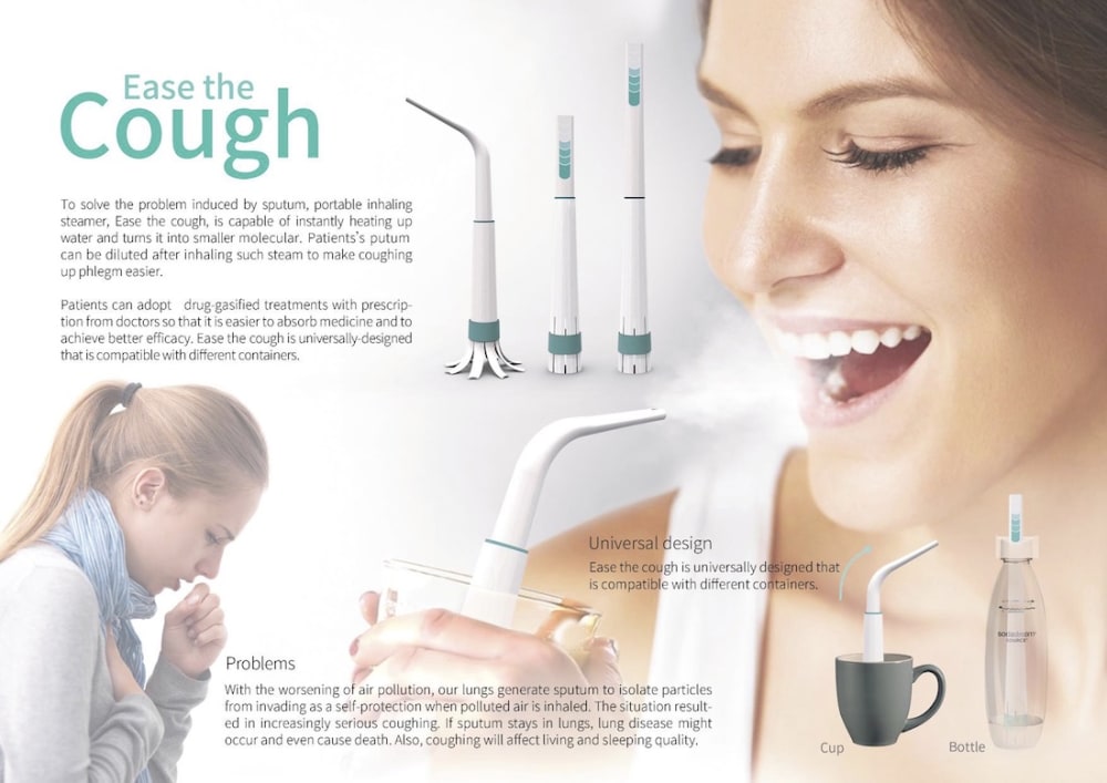 To solve the problem induced by sputum, portable inhaling steamer, Ease the Cough, is capable of instantly heating up water and turning it into smaller molecular. Patients’ sputum can be diluted after inhaling such steam to make coughing up phlegm easier.