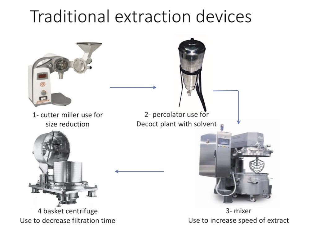 We managed to design a new device that contains a mixed feature of all these processes gathered In one device that is used for cutting, percolation, dispersing, mixing of plant in solvent for extraction of plant active material. And by addition of filtration by centrifuging and adding heat jacket. That will make these processes much easier than before with lower cost as: