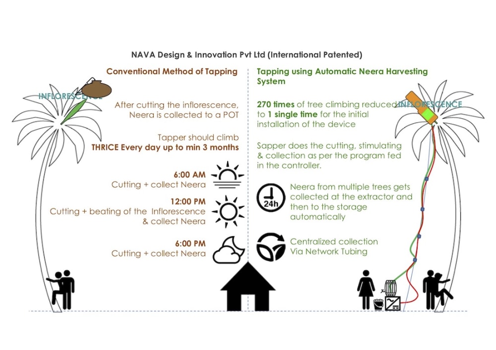 Our patent pending technology is an automatic system with the electrical powered tapping devices and an extraction unit. Once the device is fixed to an inflorescence, as per the program the mechanism inside the device will do beating and cutting of the inflorescence, then the neera oozes out will be collected and transported to the storage via network tubing.
