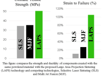 The layer-wise method of fusing material offers many advantages over other additive manufacturing methods. For example, as the build area is scaled up to make a larger quantity of parts or bigger parts, the time it takes to create them doesn’t change. This means that as the technology is scaled to larger sizes, it can compete in manufacturing throughput rates with more traditional methods of manufacturing while still providing all the benefits of additive manufacturing. Additionally, the material if fused over the course of a few seconds, rather than in microseconds as occurs in selective laser sintering, this allows more time for the powdered material to melt, flow, form a dense structure and for the polymer chains to entangle. Most plastics will not form a dense structure in additive manufacturing processes because of its inability to quickly flow when molten and is one of the main constraints which restricts the material palette available to additive manufacturing. Furthermore, the components created with this technology are 30% stronger and have approximately 360% higher elongation to failure using the same material used in other additive manufacturing systems.