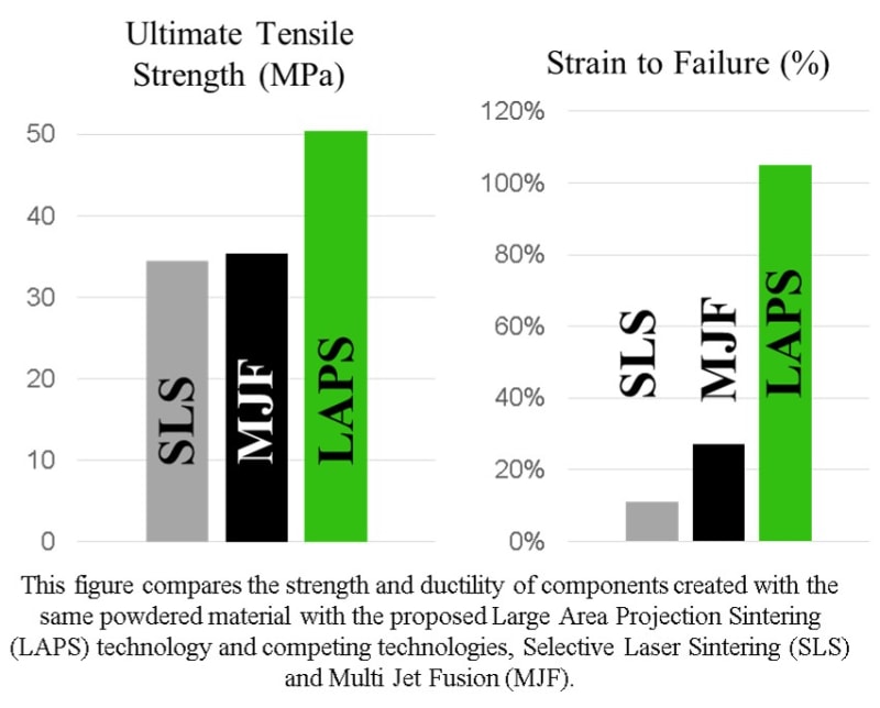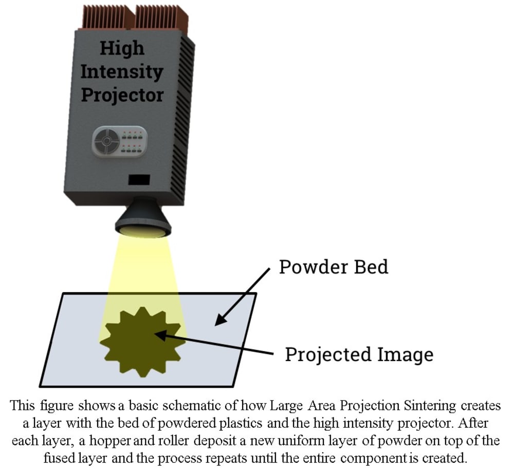 To additively manufacture a component, a digital model is digitally sliced into 2D layers. The printer recreates each of these layers sequentially, one on top of the other until the final component is reproduced. The proposed technology, called Large Area Projection Sintering (LAPS), is an additive manufacturing technology which creates entire 2D layers simultaneously with high strength engineering plastics. This technology is a powderbed fusion process, meaning that it utilizes a bed of powdered plastic, on top of which a high intensity image is exposed by a custom projector. Where the high intensity image strikes the powder bed, the material in that area melts, fuses together and resolidifies. Rather than fusing or forming material at a single point which must be rastered (scanned) over the surface like conventional additive manufacturing, this technology fuses the entire layer all at once.