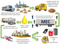 The MEC integrates a patent-pending ablative fast pyrolysis reactor with recently-developed hydroprocessing catalysts to yield up to 105 gallons of liquid hydrocarbon per ton of biomass. Each self-contained system operating independently in remote settings will process approximately 120 dry biomass tons per day, nominally producing about 100,000 barrels of liquid hydrocarbon annually, along with sufficient synfuel to power the machinery, pure carbon in the form of biochar that can be sold or used for soil mediation, and significant quantities of fresh water.