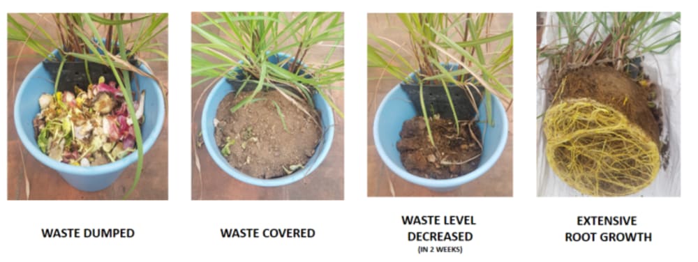 Ecopot is a bio-active pot with a coating to convert organic wastes to manure.The plants use the manure, grows well. Ecopot has a partition with root holes forming a large waste, smaller plant chambers. Lemon grass plant is shown in pot. The water drain is on the sides, not bottom - less watering & leachates of organic waste are not drained but used by plants.