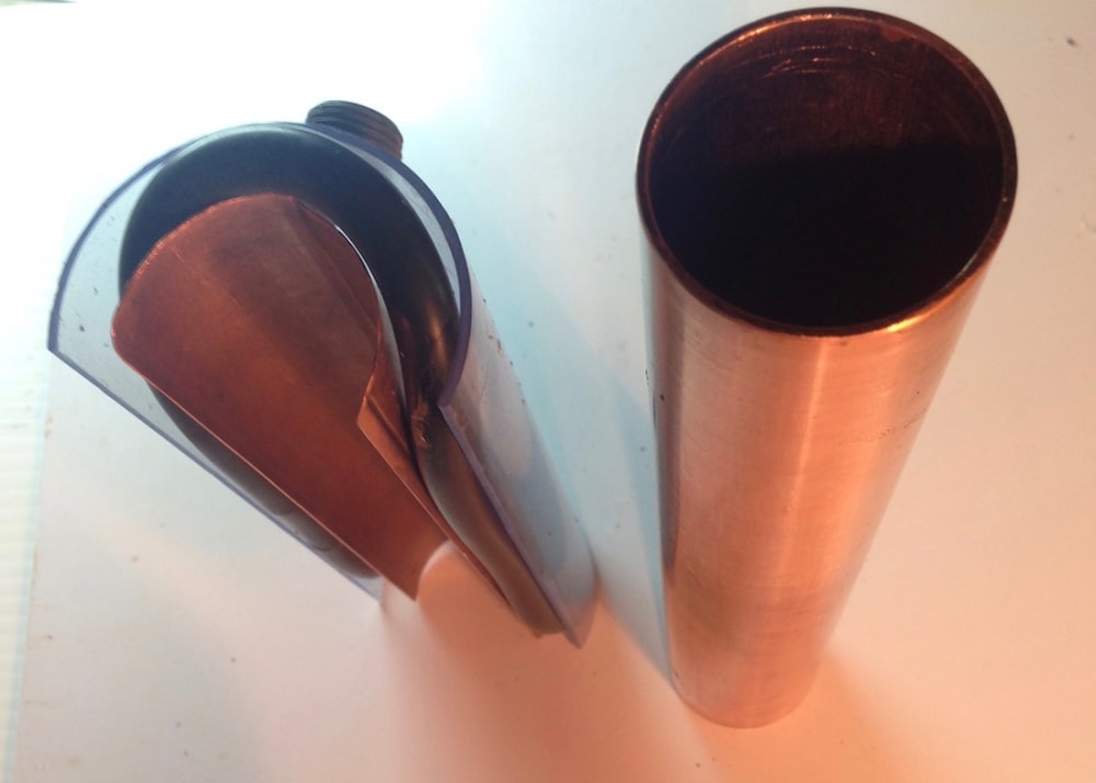Drainergy (vertical) is a copper drainpipe copper with a copper slit-sleeve wrapped around it for double wall protection against cross-contamination. The sleeve has longitudinal grooves open at each end for leaks to be visible. Both are inside a plastic tube with external water fittings and one-piece O-ring gasket in between. The gasket lies along each side of the slit and circles inside each end. The gasket is compressed in place on assembly to seal the space against normal cold water pressure. A series of spaced and notched flow compensator rings along the length spread out the cold water flow to be annular. Mesh-like sheets between generate turbulence.