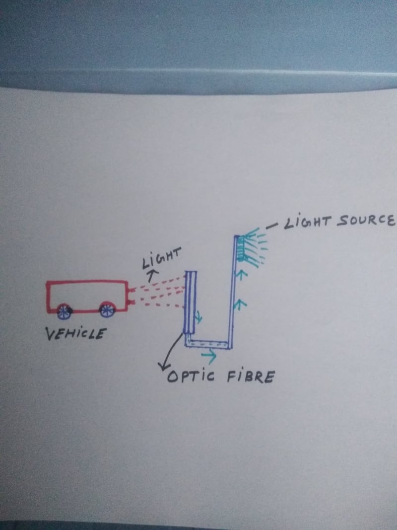 According the title, the lights of a vehicle can be reused using "fiber optics." At night the vehicle's front headlamp lights can be reused. A layer of fibre optics on the road will work to transmit the light wherever it is needed or reuse the light to light the road or streets. It will a simple but unique solution to reuse the light of running vehicles at night.