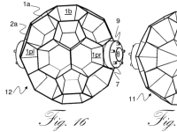 FIG. 12 illustrates a perspective view of a completed buckyball in FIG 1 rotated 36-degrees to view the rotational axis in FIG. 16 and 16a. FIG. 13 illustrates a perspective view of a completed buckyball in FIG 1 rotated 90 degrees to view the rotational axis in FIG. 1 as a front planar view.