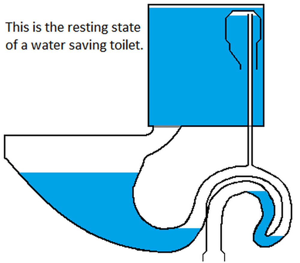 My water saving toilet system uses two traps, an upper and lower trap. When the tank is being filled, the rising water forces air between the two traps and raises the water level in the bowl. When the toilet is flushed and water leaves the tank, a partial vacuum is created between the traps sucking the water and contents from the bowl. The larger lower trapway the allows higher pressure so less water is needed in the bowl and when the tank is being emptied allows for a larger vacuum for superior performance even with less water. With the larger lower trapway (see Fig 1), the vacuum is strong enough that the water from the lower trap will combine with the water upstream to create a strong siphon. This is while having a very quiet system.