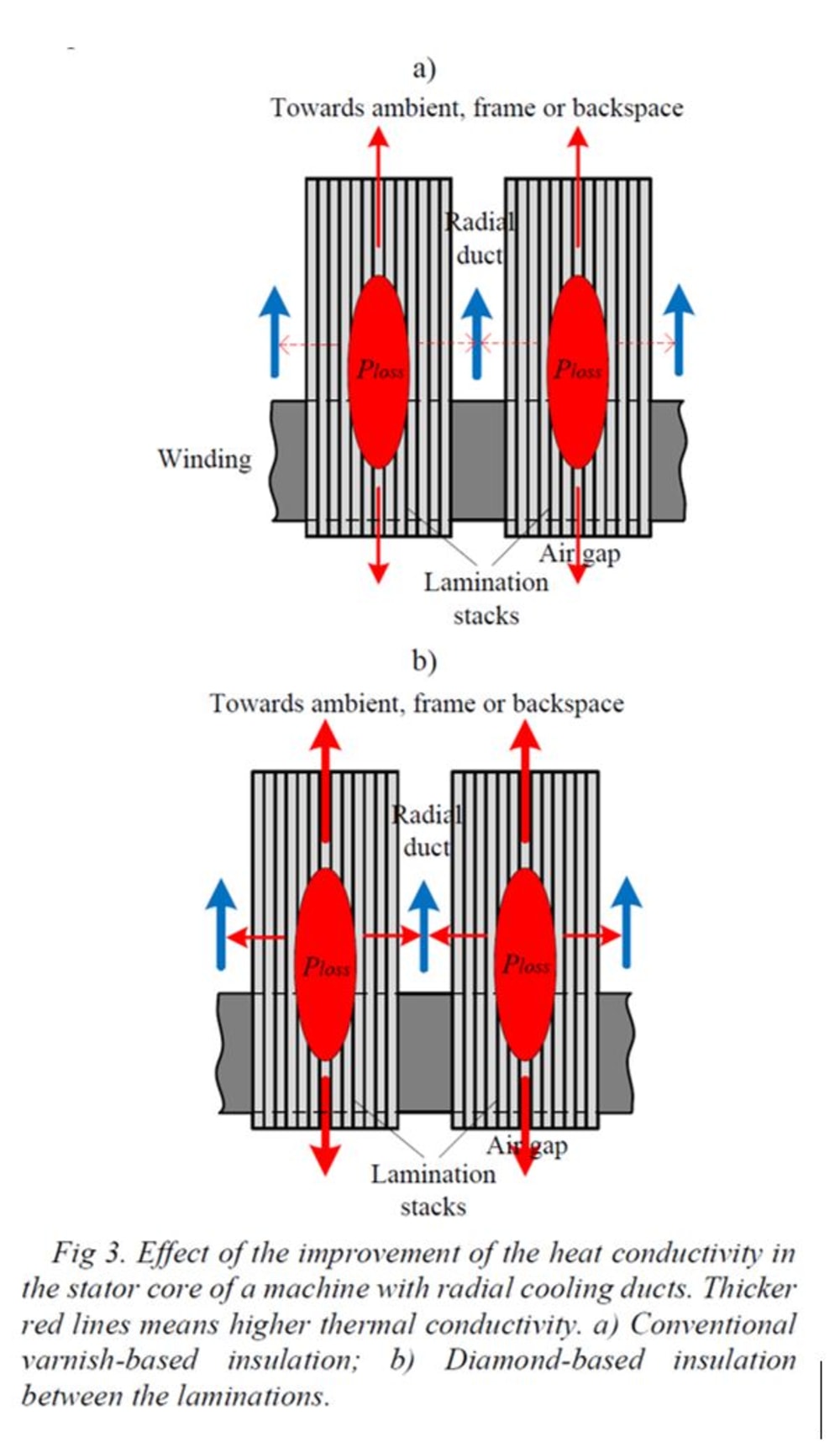 The thermal conductivity of the iron core, especially in axial direction, could be significantly increased by the use of a material with higher thermal conductivity in the insulation between the laminations. A diamond enriched material will be the right choice because besides the high thermal conductivity it can also act as an excellent electrical insulator. Its high level of rigidity can easily withstand the mechanical stresses due to pressure applied during the stacking process and the period of exploitation. The thermal conductivity of the diamond = 2.200 [W/mK] is even more than 50 times higher than the steel used for manufacturing the laminations and even more than 10.000 times higher than the varnish. We can conclude that if the insulation between the laminations contains a certain amount of diamond-based material, the thermal conductivity of the insulation layer can be improved significantly.