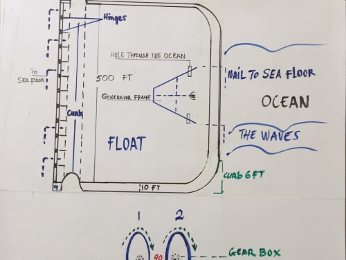 This is a Wave Turbine. This concept produces electricity. First we have to build a Float. That is 500 ft L x 40 ft W x 10 ft H, weight 3000 lbs. We have a curb 6 ft high at the edge to collect the waves.