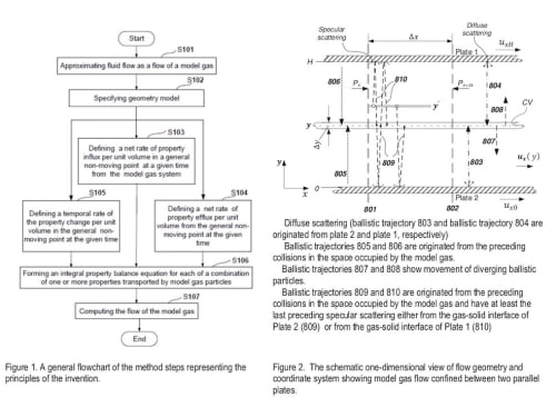 We have invented an advanced method for modeling transport processes in fluids. The method is adapted to model gas flow, including dilute gas flow at high Knudsen numbers. Instead of modeling based on using an infinitesimal fluid element of a continuous medium, the method approximates fluid flow as a model gas flow.