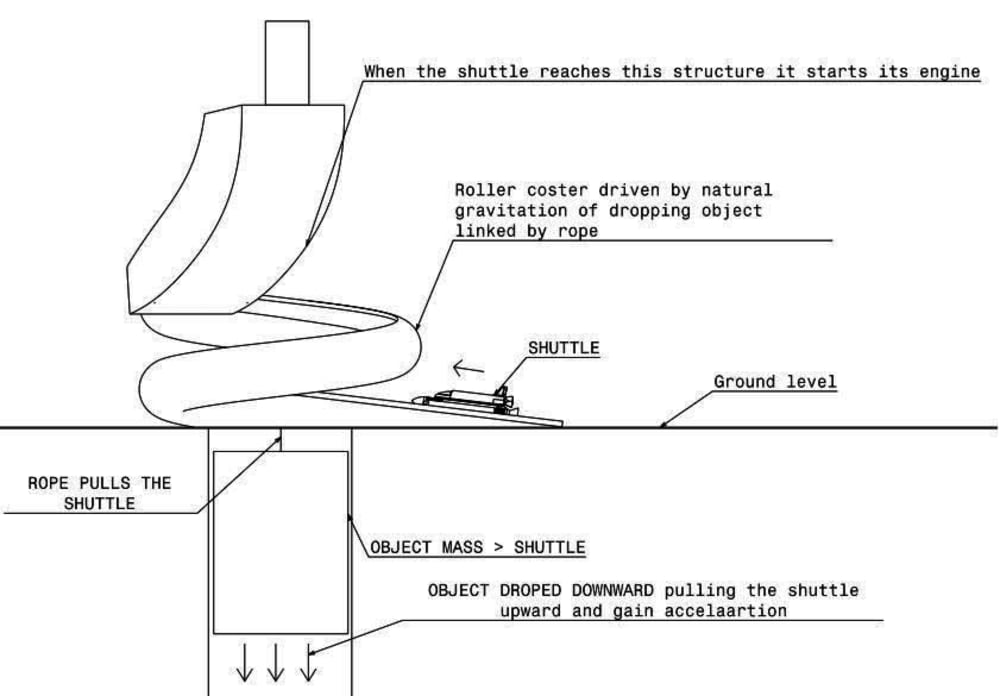 This project is about building a mechanism that uses gravitational force to launch space shuttles instead of against it to achieve the escape velocity with lower cost. This is done by integrating roller coaster principle, Newton law and existing shuttle mechanism. First we build a roller coaster which can transport space shuttle. Then we make hallow shaft below ground in center of the roller coaster. In the hallow shaft we fix an object which has more weight than an ordinary shuttles. The object is fixed with the rollers of the roller coaster by pulley and high strength multiple ropes. Then we place the space shuttle on the transporting rollers and we drop the underground object in free fall. Since the object is connected with the rollers of the roller coaster it pulls the space shuttle up ward because of the weight difference and the pulleys are fixed from the top thar will force the rollers carrying the shuttle be pulled fast. This mechanism makes the space shuttle gain acceleration quickly and travels upward in high speed via the roller. When the shuttle reaches a certain speed and point it activates its engine. At this point the energy consumption to lift the shuttle is far less than the shuttle starts from 0 meter per second. This mechanism helps the shuttle collect potential energy which is converted in to usable energy for the launch. Because the dropping object has extremely high weight, a fluid damping mechanism is used in the underground shaft. Meaning, there is a large amount of fluid at the bottom of the shaft and when the dropping object reaches the bottom the fluid prevents it from high impact acting as a natural damper. Then to start another launch we can slowly elevate the massive object underground to ground level and start the process again. I have done the numerical analysis and the result checks out. But simulation is needed to make the idea more presentable to clients. This mechanism is simple and what makes it different is in the scale of the weight and there are far more complex structures and mechanism has been built in the world.