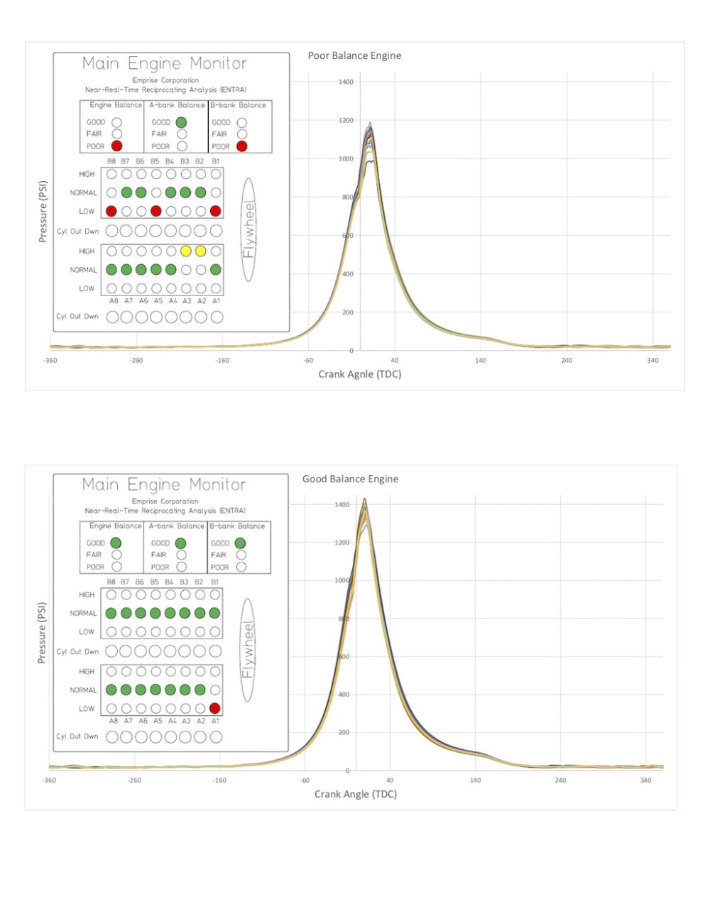 Figure 3 displays two PT curves for an engine in poor balance and later in good balance after maintenance. Currently, Crew Engineers have to interpret the PT curves after RA data is collected and downloaded to the ship’s computers to evaluate the subtle nuances that indicate the engine condition. This crew interpretation requires a substantial investment in training to maintain analytical proficiency, something that is difficult for rotating crews. Shore side analysts likewise perform their independent analysis of the data. Alternatively, examples of ENTRA HUD displays of the CBI assessment is depicted in the illustrations to emphasize the ease of interpreting HUD displays in comparison to PT interpretation.