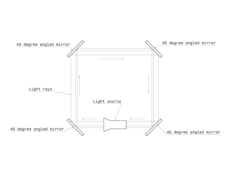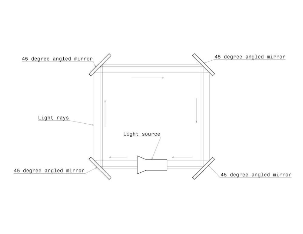 This project is about doing an experiment on circulation of light. It is known that mirrors can reflect light and there is a device called the periscope used for this purpose. The mirrors of a periscope are fixed 45 degrees to reflect light. What if we place four mirrors at an angle of 45 degrees as seen in the picture and shine a light on one end as seen in the figure. Assuming that the media is ideal and the mirror can reflect 100 percent and if we move the light source away from the mirror faster than the speed of light, does the light rays keep circulating? This project is only some part of the project I am developing but it is critical I know the answer to it and I need a simulation test or actual test to proceed to the black hole experiment.