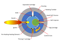 The Mg cartridges used as the primary propellant are cast in a mold that places cavities of varying sizes throughout the solid. These cavities enable the injection of XeF2 during the priming process. Multiple cartridges are inserted and housed in a heated tumbler which rotates within the thruster module. As the tumbler rotates within the module, cartridges are held at specified points where they are primed, pre-heated, and ignited. A new cartridge starts empty of XeF2 and moves to an injector where it is primed with XeF2 in either its liquid or gaseous state. Thruster performance can be modified by varying the density of XeF2 injected into the Mg cartridge via temperature or pressure. After injection, the now primed MAX cartridge rotates through a supporting preheating element to bring the temperature of the propellant closer to its ignition point. When the propellant is ready for ignition, the tumbler will rapidly move the cartridge into position aligned with the thruster nozzle while a continuous arc ignition source simultaneously ignites the heated propellant. The resulting reaction and generated product is directed from the cartridge housing and through the nozzle for thrust generation.