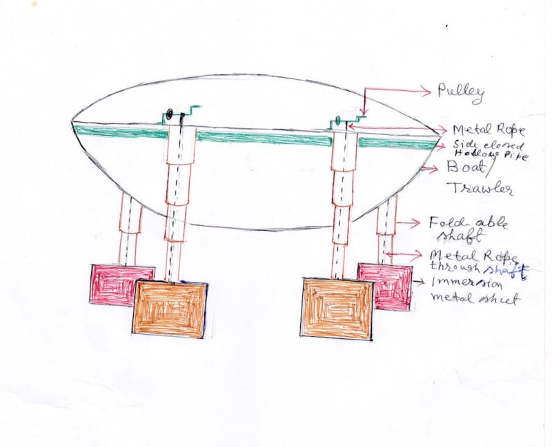 For this system, four foldable/contracting shafts (many hollow pipes will be placed into a hollow pipe, one after one) to be fitted at the two sides of boat by keeping same distance and same position. These foldable shafts can be spread up to 20 – 50 meters towards depth of river or sea. One square metal plate of 3 to 5 meters to be fitted at the end of each foldable shaft and it will be folded by pulley system from the boat. When the boat will run, the system to be kept at unfolded condition. Except it, a two sided closed hollow metal pipe of 2-3 feet diameter to be fitted at the top position outside of the boat.