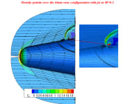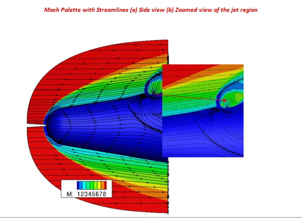 Computational Fluid Dynamics (CFD) simulations have been performed over a blunt cone configuration with and without lateral sonic jet injected into hypersonic laminar flow at Mach 8.1. The comparison of pressure ratio indicates good match with the experimental results for no jet case. The simulation with sonic jet results in a complex flow field interactions like shock-boundary layer, shock-shock interactions, barrel shock, Mach disk, primary and secondary separations ahead of the jet etc.,. The comparison of pressure ratio indicates over-prediction of the plateau pressure rise and under prediction of the pressure rise due to the detached shock. The empirical estimates of separation distance, detached shock standoff distance, plateau pressure and jet penetration height matches well with the present CFD results.