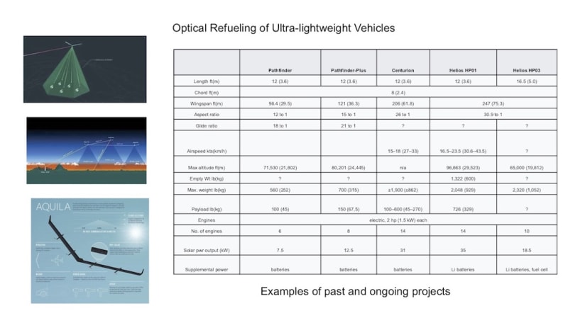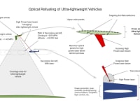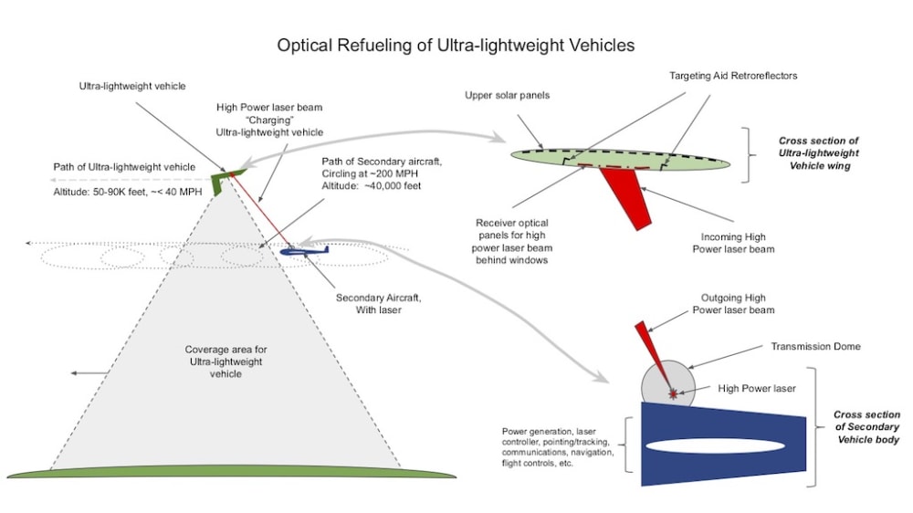 The ultra-lightweight vehicle typically flies at 50,000 to 90,000 ft, with a speed of about 40 mph and the secondary ‘recharge’ aircraft would fly at ~40,000 feet and at ~200 mph. The secondary vehicle can circle below the higher vehicle and ‘track’ it as the higher vehicle goes along it’s required path. The higher vehicle can have targeting retro-reflectors, around the optical receiver panels on the bottom of the wings, to aid in the targeting, acquisition and aiming of the high power ‘recharging’ beam. This provides a clear, stable ‘target’ return for the charging laser light.