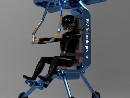 This is a design for a single person flying vehicle. This is an electric flying vehicle that uses two high speed counter rotating ducted fans to create lift. The fans are 36 inches in diameter. The estimated flight time is about 20 minutes with the current battery technology. The vehicle will be able to lift one 250 lb. person.