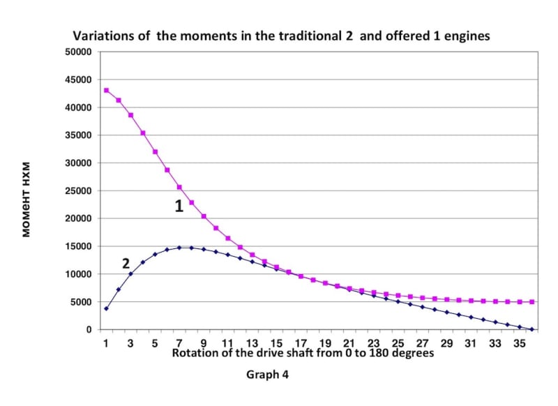 The change in torque values in the proposed engine is determined only by the change of pressure in the cylinder. The arithmetic average of the moment in the proposed engine is 1.83 times the arithmetic average of the moment in the traditional engine.