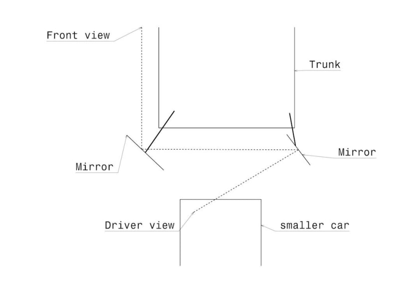 The problem with this solution is that it is not applicable to all types of trucks or buses and it has low durability because of the screens can be damaged easily. This project is about building a mechanism that can replace this device but have more durability and be less costly. This is done by using a periscope principle as seen in the diagram. By installing two mirrors at angle x, the driver of the car can see one of the mirrors clearly. This will function the same as Samsung's solution and will have far less cost and far more durability. It is also can be used in any large vehicle. This is a proposal to Samsung and all the detail design will be uploaded soon.