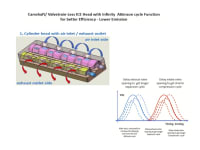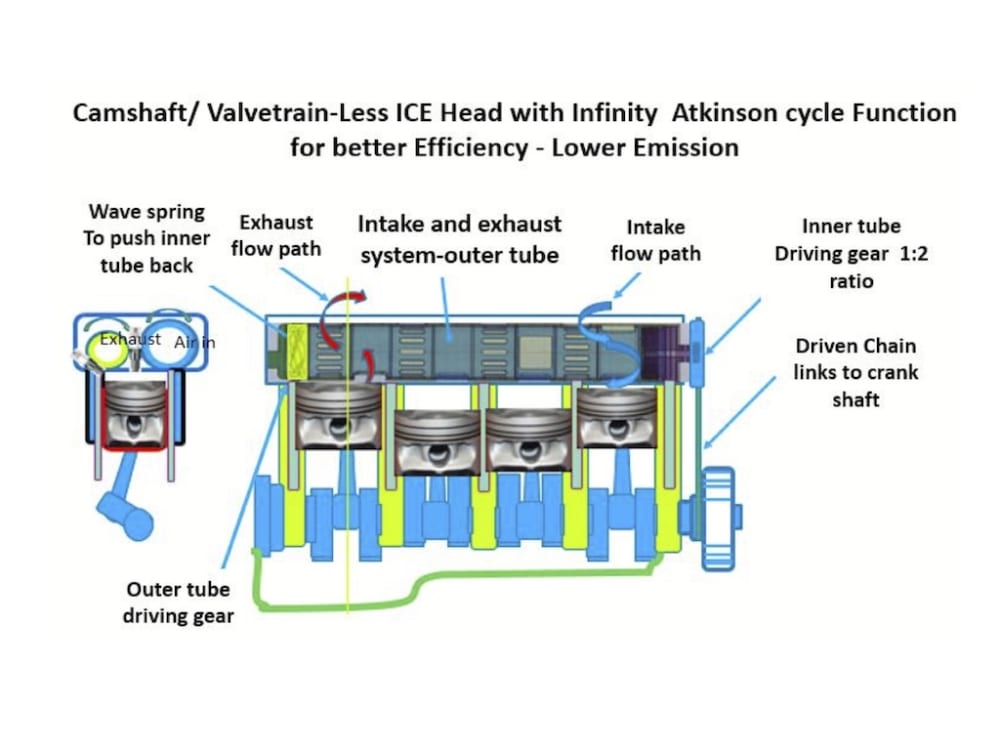 The exhaust gas set to guide exhaust flow pass open port of outer tube and inner tube port, inner tube out ports that overlap to outer tube out ports, then exists through the cylinder head into exhaust pipe. There is a driving gear on intake outer tub. The ECU controls the motor to drive outer tube to turn at clockwise advance to make compression cycle timing delayed, so inner tube has to catch up longer time to close the expansion cycle, this makes the power stroke to be further power than the compression stroke, this is the Atkinson cycle second part.