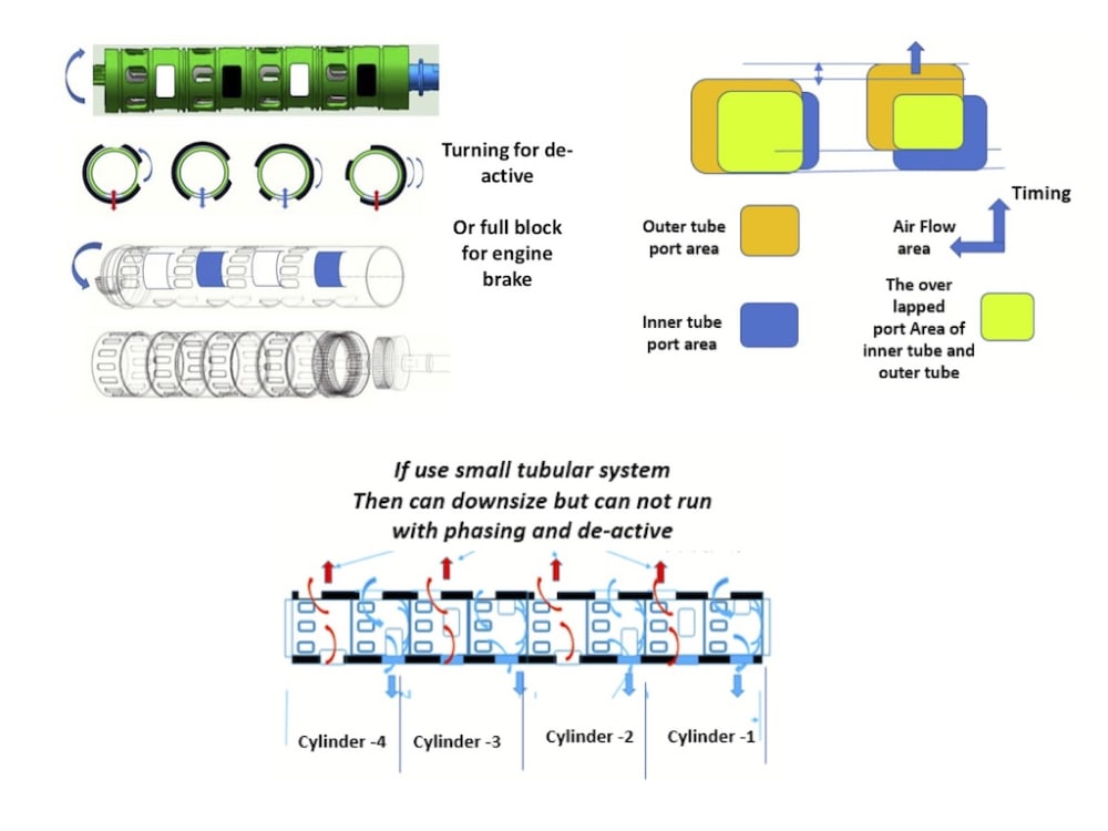 This innovation can make diesel engine with engine braking function. When the two set outer tubes are driven by the gear to turn to let the outer tubs no opening section to block both set exhaust port and intake port at same time, this make completely the engine brake. When the outer tubes are turned to counterclockwise to block some exhaust ports and relative air inlet ports that means engine has been de-active some cylinder for better fuel saving. Shown in illustration 3.