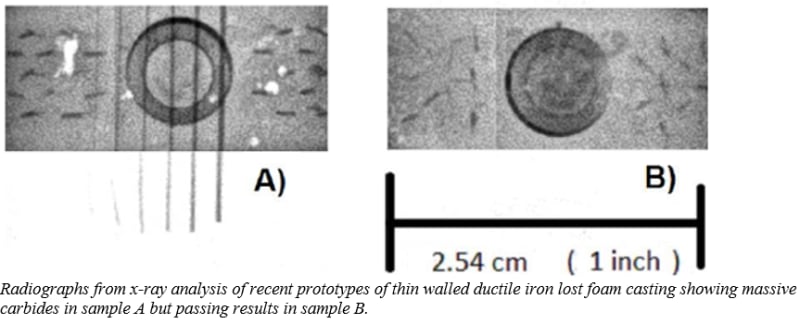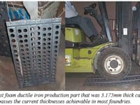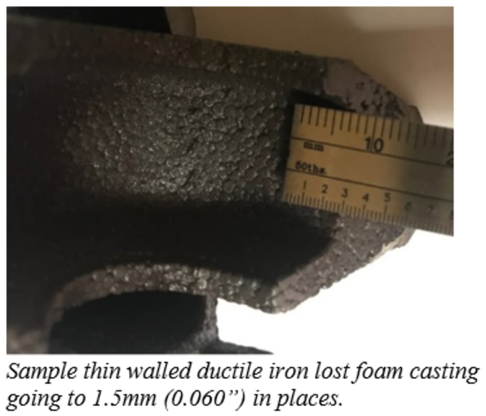 We are working on a DOE SBIR to show that recent prototype efforts to go to 0.060” with lost foam thin walled ductile iron can have the same mechanical properties as normal thickness castings and are defect free. This thickness which is less than many stampings has been achieved through innovations in the foam blowing process which permit thinner foams. The iron lost foam casting process is still the normal process parameters. This means that iron will beat any aluminum parts currently thicker than 0.250”. The process will allow any existing steel or iron casting to have significant weight reductions as well.
