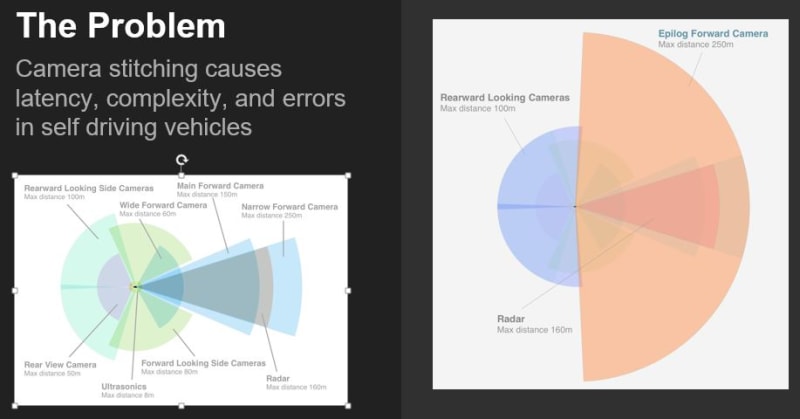 Epilog’s video imaging technology replaces pods of multiple cameras and lidars with a single panoramic 180o view super-high resolution (at least 8K), high speed, inexpensive video camera. This approach provides a much more accurate view of the vehicle’s environment, making object recognition and identification safer. At the same time manufacturing and TCO complexities are greatly reduced. Current autonomous vehicle sensor stacks can cost $150,000 on top of the vehicle cost. Epilog replaces this with a computational camera for hundreds of dollars.