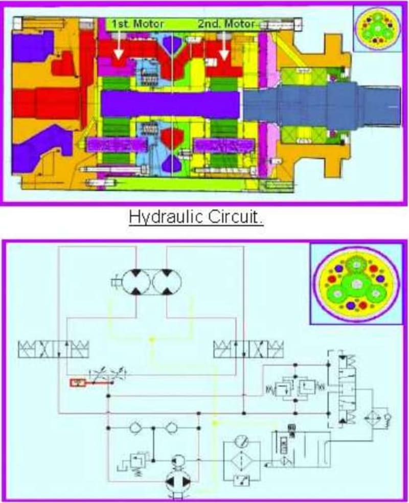 Basically, GoldDrive consist of one hydraulic motor with fixed body running CW and on its output shaft a second hydraulic motor is mounted having same displacement running CCW rotation. By supplying same flows to each, resultant speed is zero. By controlling flow ratio and direction we can get +/-2n acting according the equation T torque=Ppower/n1RPM+n2RPM , n1 and n2 can be controlled as either CW or CCW rotation independently.
