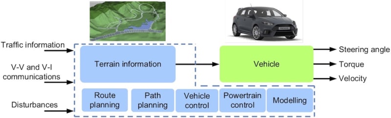 Thanks to the development of V-V and V-I communications, the energy efficiency of autonomous vehicles can be further improved based on the connectivity of vehicles. Figure 3 shows the architecture of this method. Before departure, the optimal route and speed profiles are optimized based on terrain and average traffic information. In driving, the profiles are updated according to the real-time traffic information, the sharing of neighbor vehicle positions, and the detection of disturbances using on-board sensors. This solution composes planning, control and modelling. It is applicable to vehicles with various propulsion systems including ICE vehicles, hybrid vehicles and electric vehicles. The proposed entry can save promising vehicle energy consumption, which paves a way to smarter and greener future mobility systems.