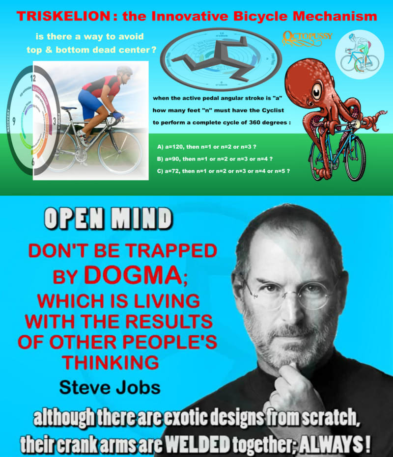 Older attempt(Rotor Cranks) had proposed solution where dead-centers are eliminated and Cyclists liked this feature, but there was only 5-degrees overlapping, instead of impressive 60-degrees of this Mechanism for mean/everyday Cyclist(TRISKELION), which overlapping increases up to 136-degrees(OCTASKELION:version for professional athletes only).