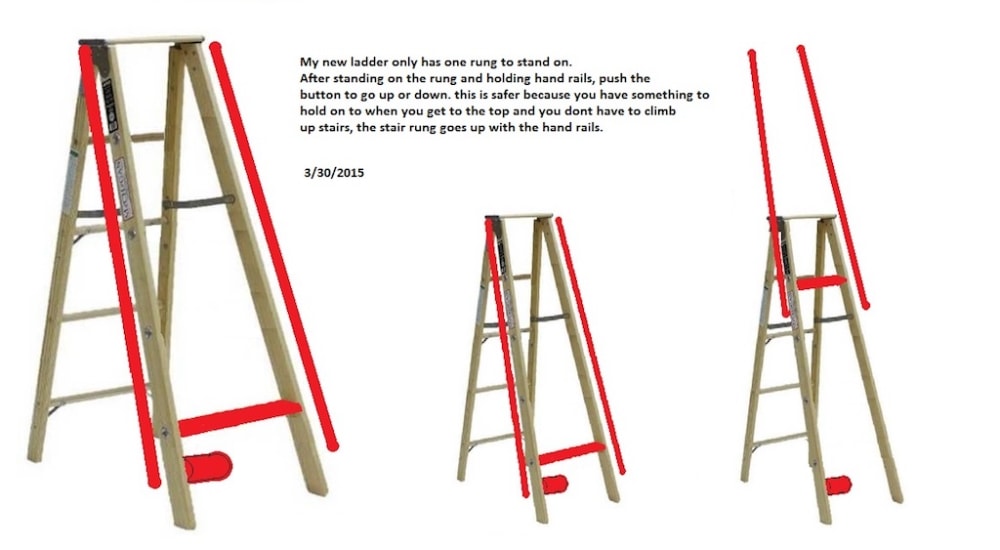 This ladder uses the batteries from your power tools to power the ladder up and down. The ladder has only one rung that you stand on, and it goes up and down by pushing the button on the handle that you hold, or it could be controlled by your foot. This way you don't have to step up and down.