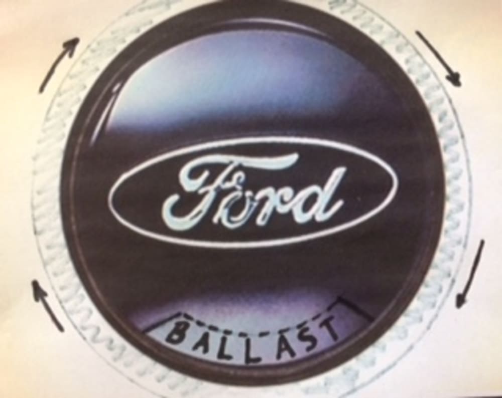 The center part, the one displaying the logo, is made of two discs connected in such a way as to overlap the mounting ring. This is built with a heavier bottom portion (BALLAST) which always keeps the logo in a vertical position.