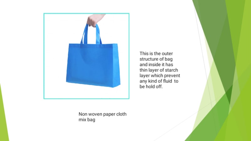 It is a bag which is non woven that can replace polythene bags. It is made by mixing paper, cloth and starch obtained from corn in a definite proportion as per desired requirements. It has enough tensile strength that to polythene bag. The variation lies at customer side i.e if he carrying dry items the paper - cloth greater ratio bag will be provided wheras if someone has to carry heavier or denser item then he will be provided with bag that has greater starch to cloth ratio.This bag will be levelled for respective purposes in it's variant.