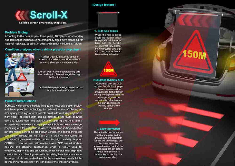 SCROLL-X combines a flexible light guide, electronic paper display, and laser projection technology to reduce the risk of placing an emergency stop sign when a vehicle breaks down during daytime or night time. The reel design can be installed in the trunk, allowing users to quickly open the Scroll-X after opening the trunk, and it automatically activates the enlarged vehicle breakdown message; combining with the projection of laser dynamic lane shifting indication several meters behind the breakdown vehicle. The approaching cars can clearly identify the warning from a distance to improve the chance of high-speed collision when the night visibility is poor. SCROLL-X can be used with mobile device APP and all kinds of hooking and standing accessories, which is widely used for temporary stop of bus and ambulance, police car pull-over stop, road construction and cleaning, etc. With the driving lens, the front view of the large vehicle can be displayed for the approaching cars to let the approaching vehicles know the condition of the preceding vehicle.
