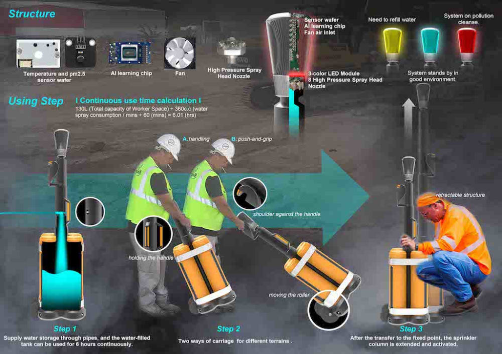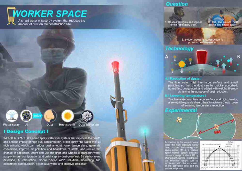 WORKER SPACE is a smart spray water mist system that improves the health and serious impact of high dust concentration. It can spray fine water mist at high altitude, which can reduce dust amount, lower temperature, generate convection, improve air pollution and heatstroke of staffs, and reduce the chance of explosion. Users can use the grips and wheels to transport water supply for unit configuration and build a spray dust-proof net. By environment detection, AI calculation, mobile device APP, real-time monitoring and adjustment configuration, it can save water and improve efficiency.